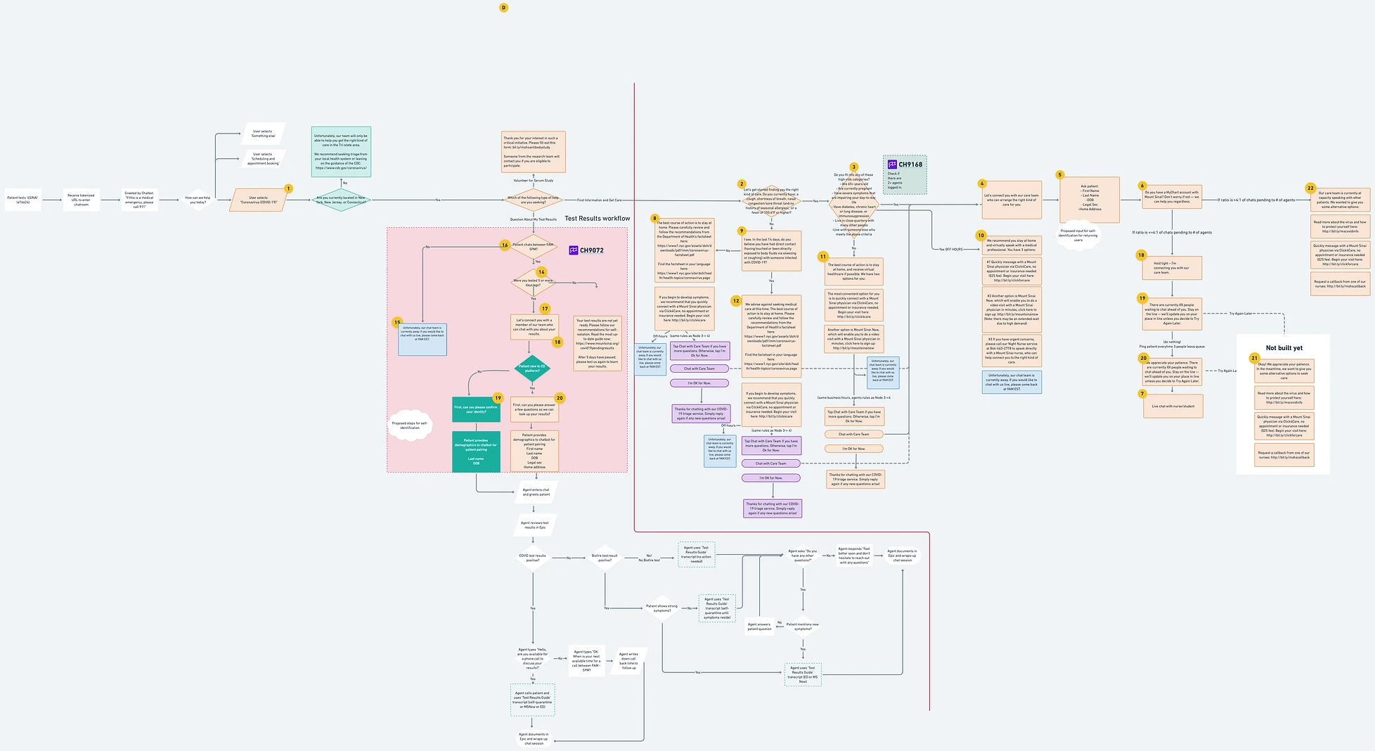 After identifying the best medium, we got to work on creating the bot flow (decision tree). This required daily reviews with the Ambulatory practice team, a group of project managers and clinicians advising us on changes to staffing (who would staff the live chat portion of our chat flow), updates from the telemedicine team (managing video visits and whether they could have patients directed to them), as well as rapidly changing guidance from the CIty of New York and the CDC around COVID symptoms. Over the course of 2 months, we made changes everyday around: symptoms triage, resolution endpoints, chatbot behaviors.